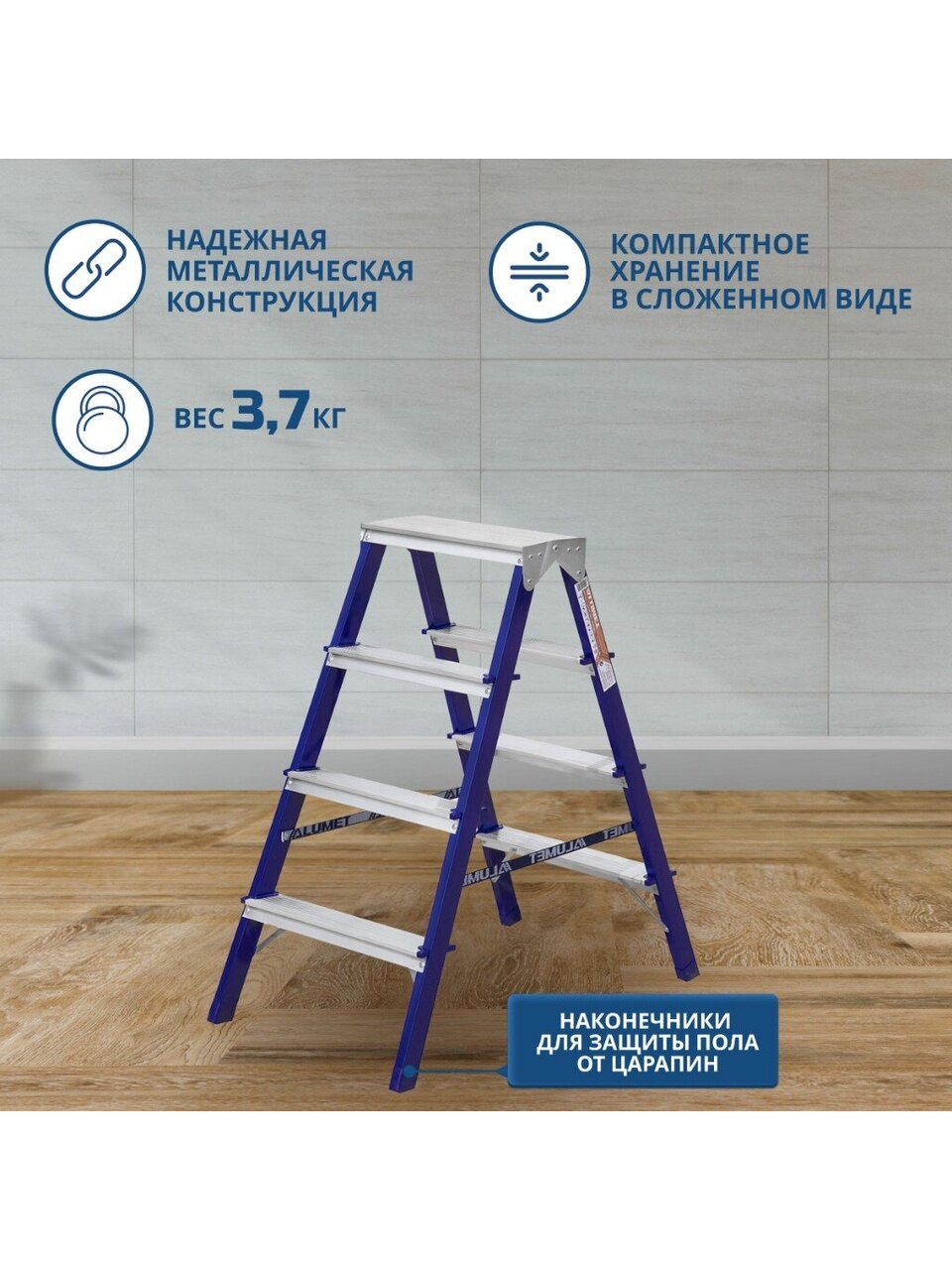 - Стремянка складывается и в транспортном положении занимает не много места.