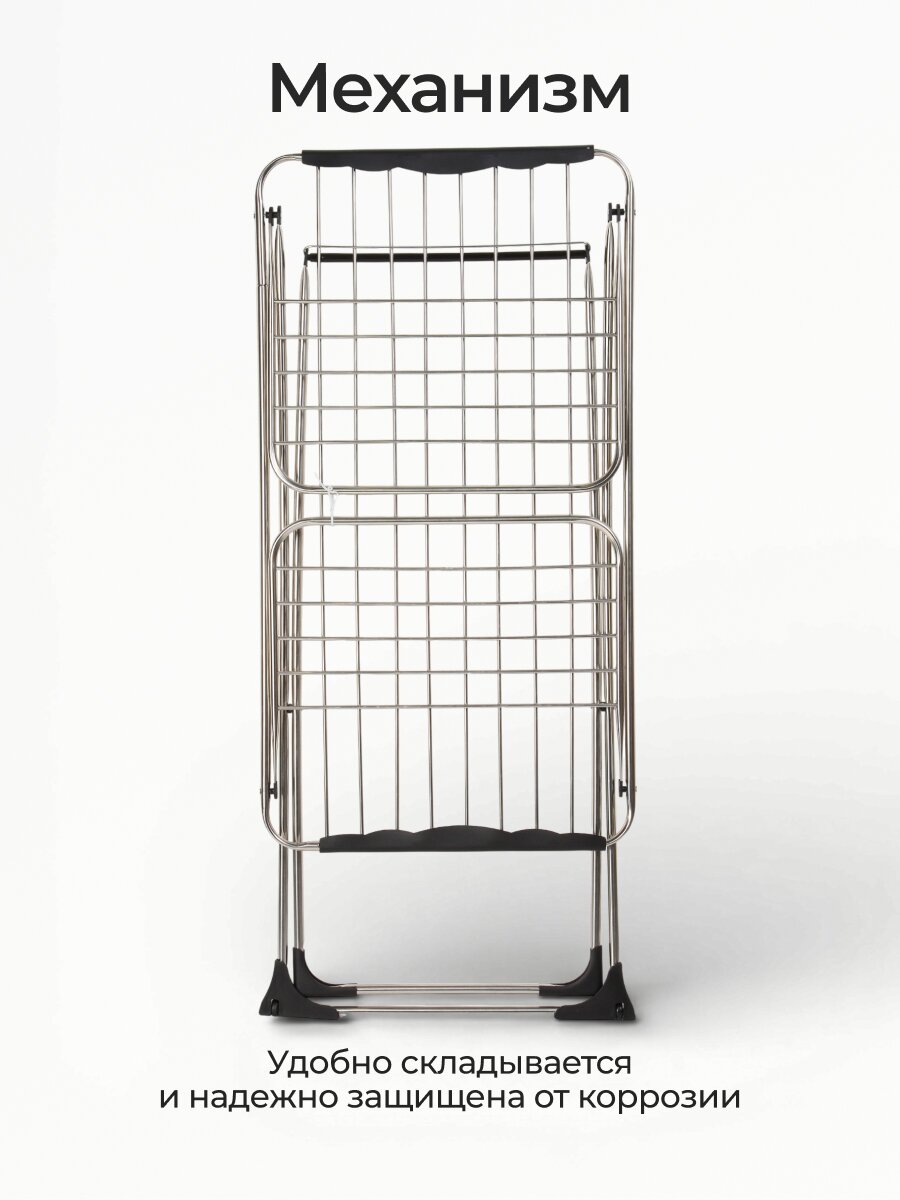- Большая рабочая длина 18 м при компактных размерах 170х57х100 см — удобно для сушки постельного белья и одежды.