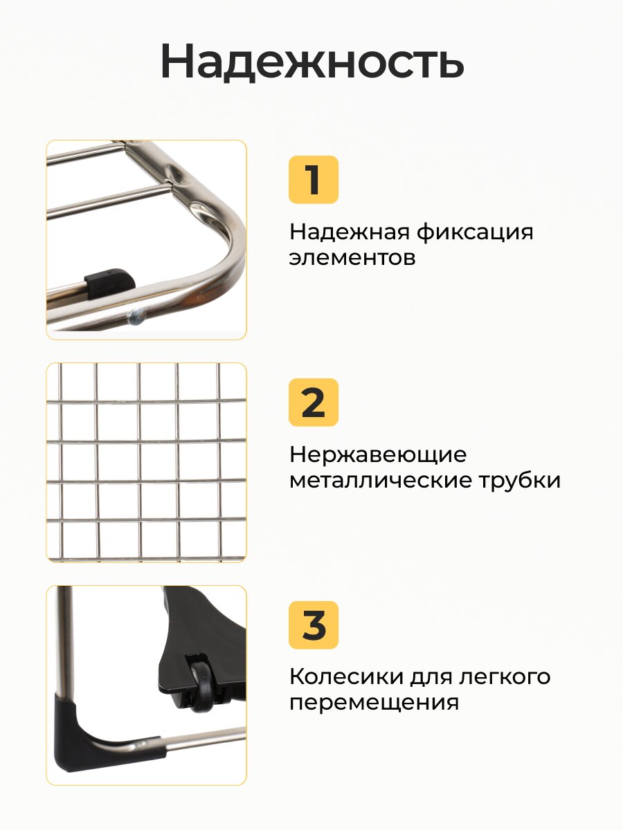 Как использовать сушилку для белья? Просто разложите конструкцию, зафиксируйте, развесьте белье и при необходимости переместите сушилку в удобное место. Она подходит для любых типов тканей и сценариев: ежедневная сушка, сезонная смена гардероба, использование на даче или в городской квартире. В отличие от моделей без колес, здесь вы не ограничены одним местом установки.