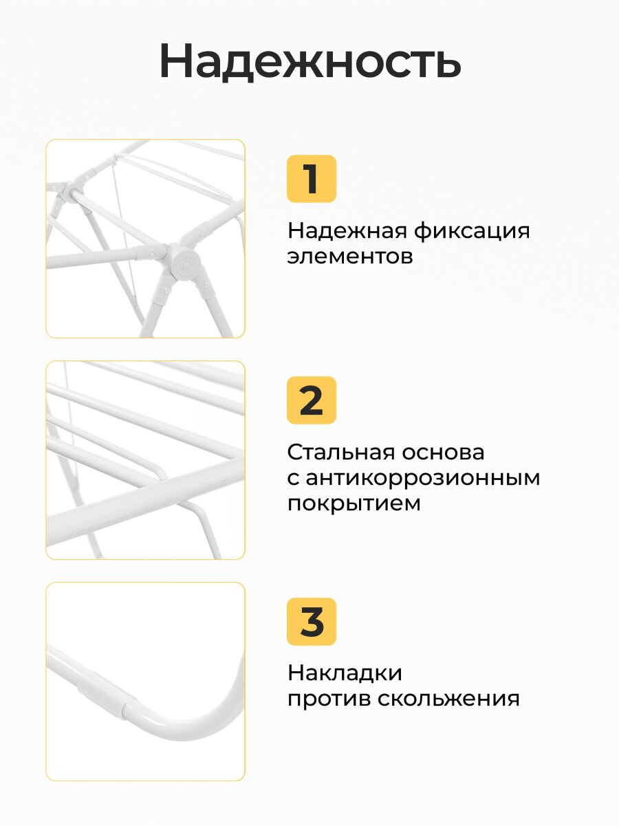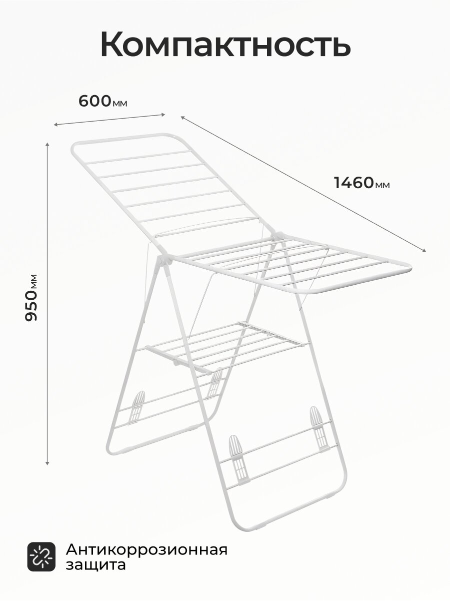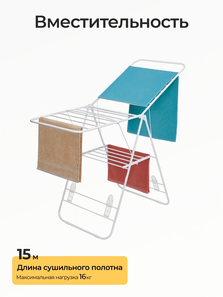 - Два уровня и 16 м полотна — удобно сушить до 2 загрузок белья за раз