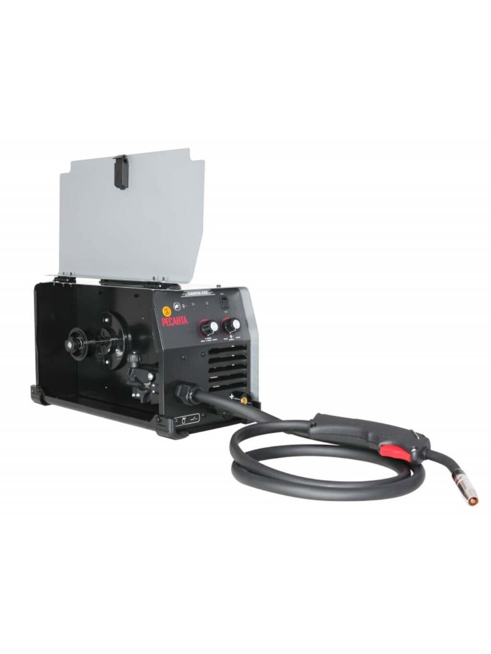 Для подачи сварочной проволоки и защитного газа, на передней панели расположен рабочий удлинитель-проводник со специальным пистолетом. Пистолет снабжен клавишей, нажатие на которую вызывает поступление проволоки и газа через сопло в область сварки. Рядом расположено крепление для кабеля, обеспечивающего замкнутость электрической цепи.