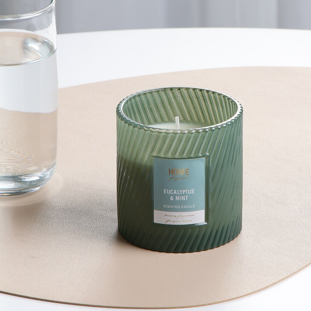 Свеча обладает натуральным ароматом эвкалипта и мяты, который помогает расслабиться, освежает воздух и способствует созданию спокойной атмосферы в помещении.