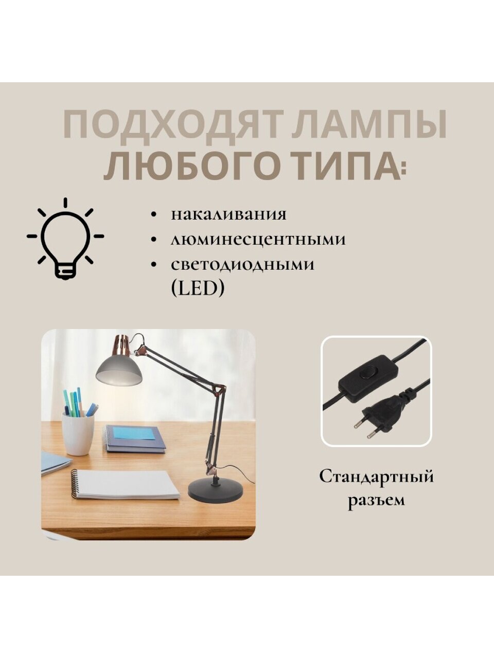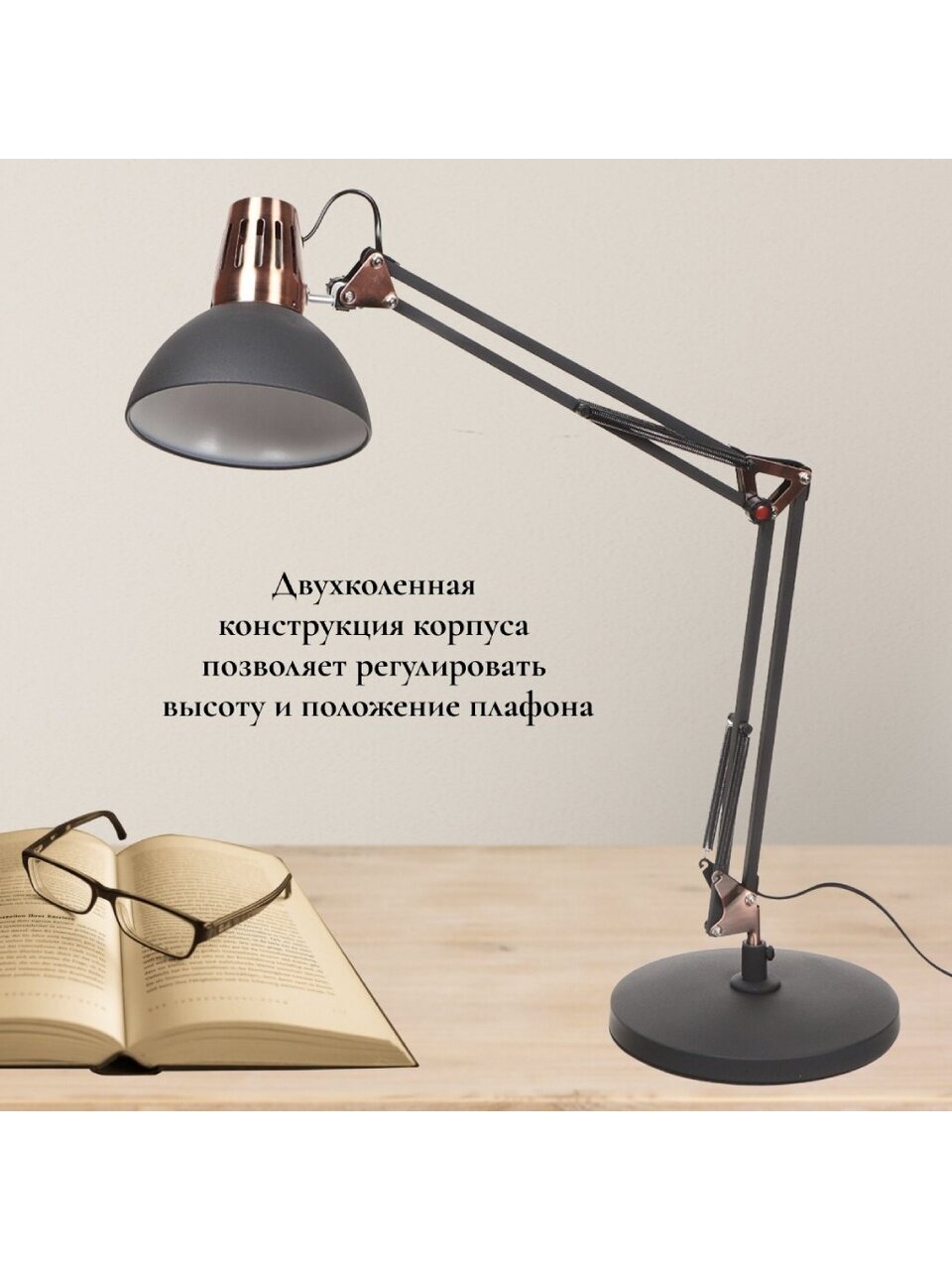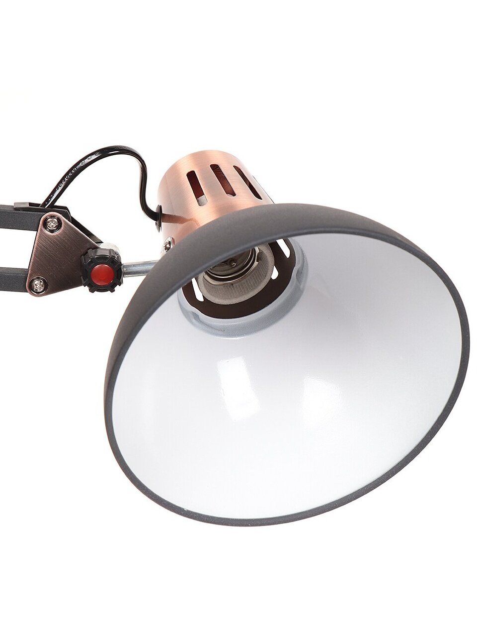 Настольная лампа предназначена для освещения рабочего стола. Корпус выполнен из прочного материала. Нейтральная расцветка корпуса позволит изделию дополнить любой дизайн интерьера, будь то жилая комната или офисный кабинет. Складная конструкция и поворотный плафон позволяют регулировать направление света.