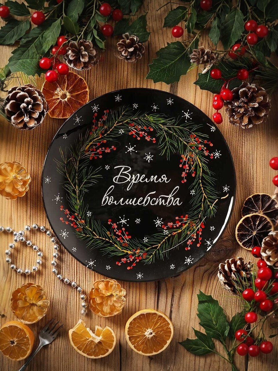 - Уникальный дизайн с зимним растительным орнаментом — создаёт атмосферу уюта и праздника на столе