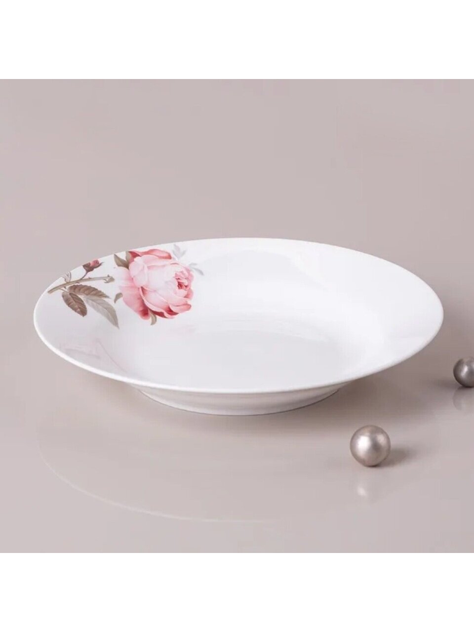Диаметр — 20.5 см, высота — 3.5 см, форма — круглая, тип — глубокая суповая, цвет — белый с цветочным рисунком.