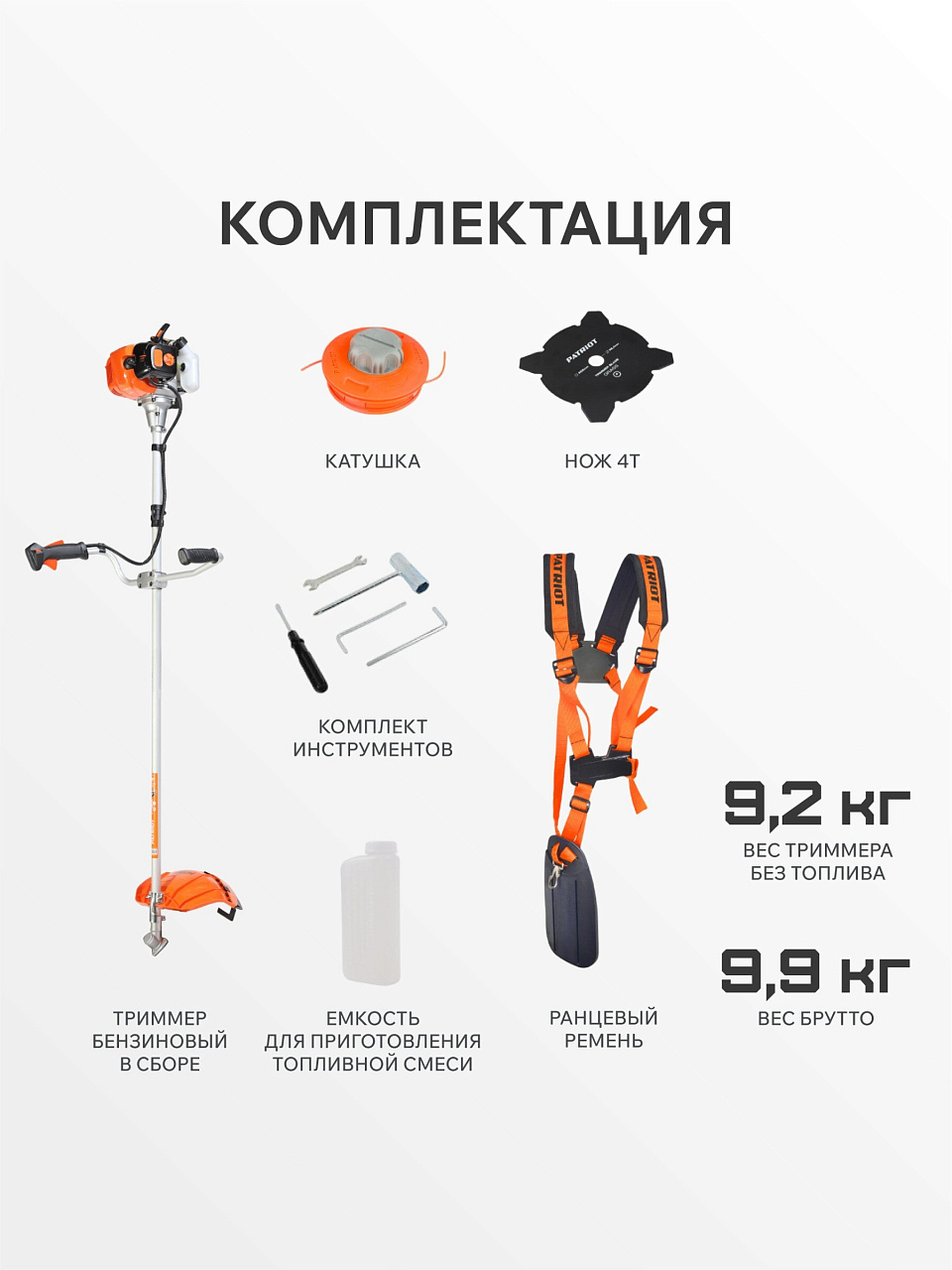 Бензиновый триммер Patriot работает автономно, не требует подключения к сети, обеспечивает стабильную мощность и подходит для длительных сессий. Это удобно для работы вдали от розетки и при высокой нагрузке.