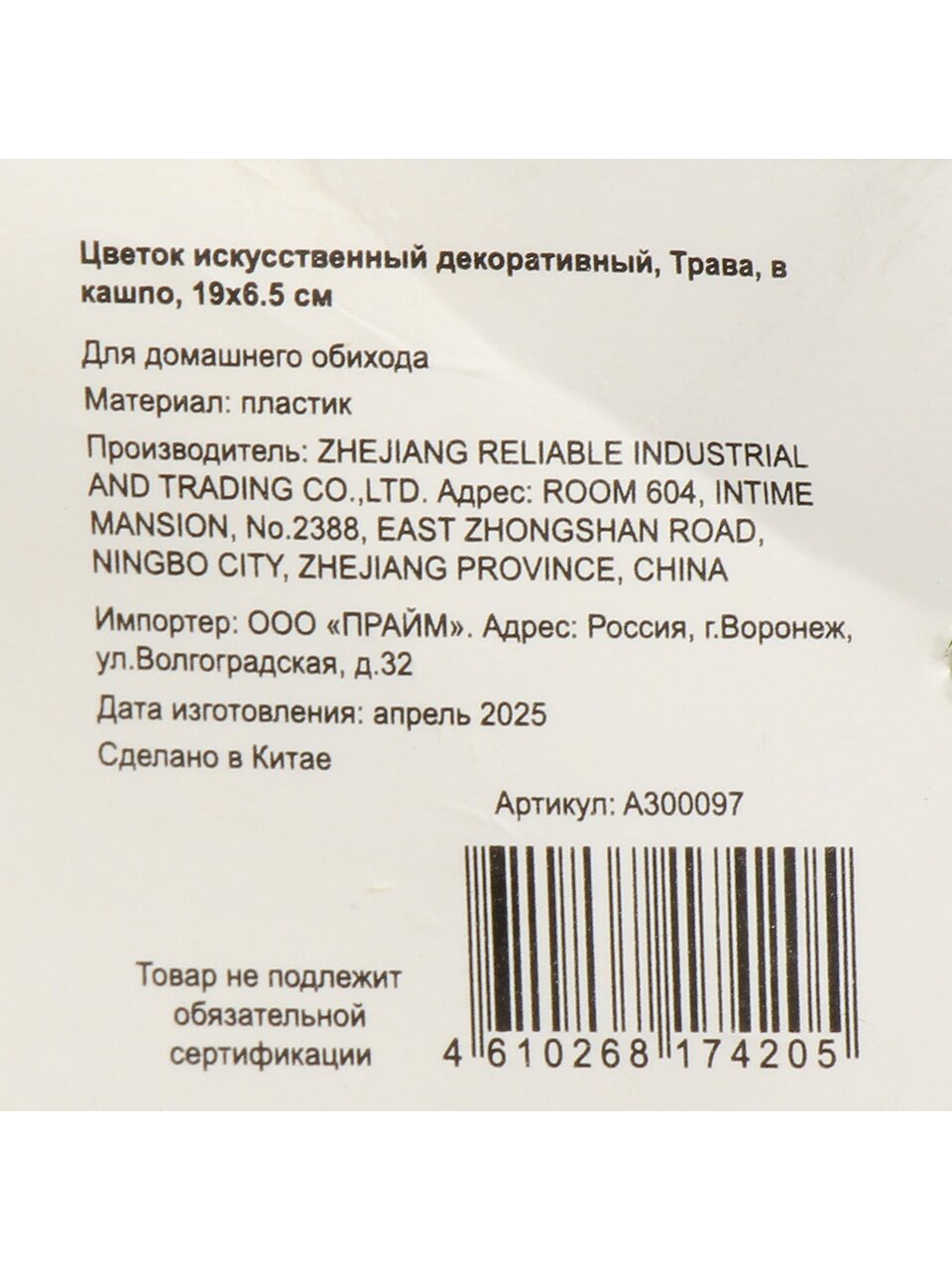 Размер декоративной травы — 19х6.5 см, что удобно для размещения на небольших поверхностях. Для SEO-выдачи округляется до 20 см.