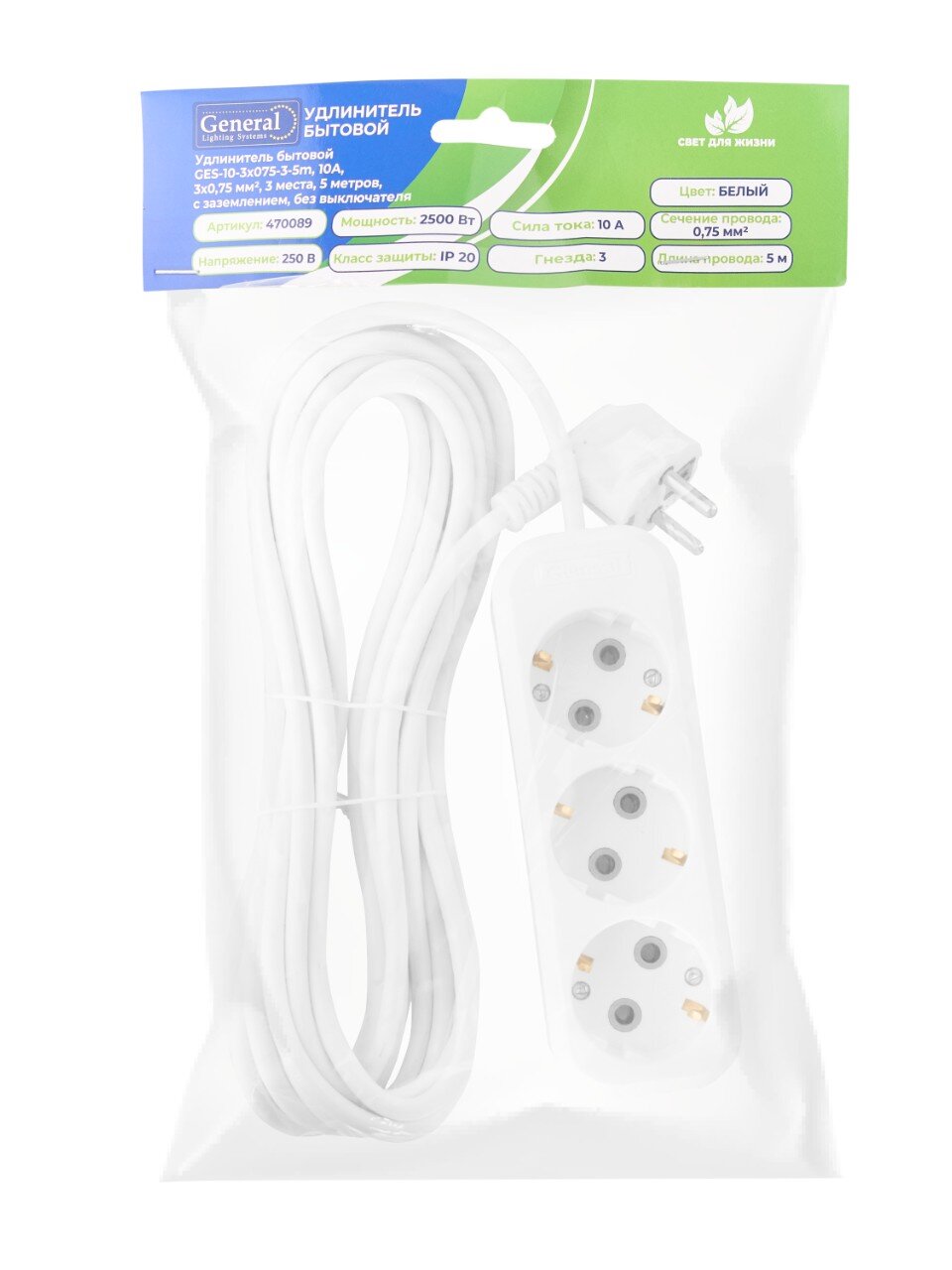 Вы можете приобрести «Удлинитель бытовой 3 гнезда, 5 м, ПВС, 3х0.75 мм², с заземлением, 10 А, 2200 Вт, General Lighting Systems, 470089» и другие товары в нашем интернет-магазине в Смоленске по низким ценам и с бесплатным самовывозом.
