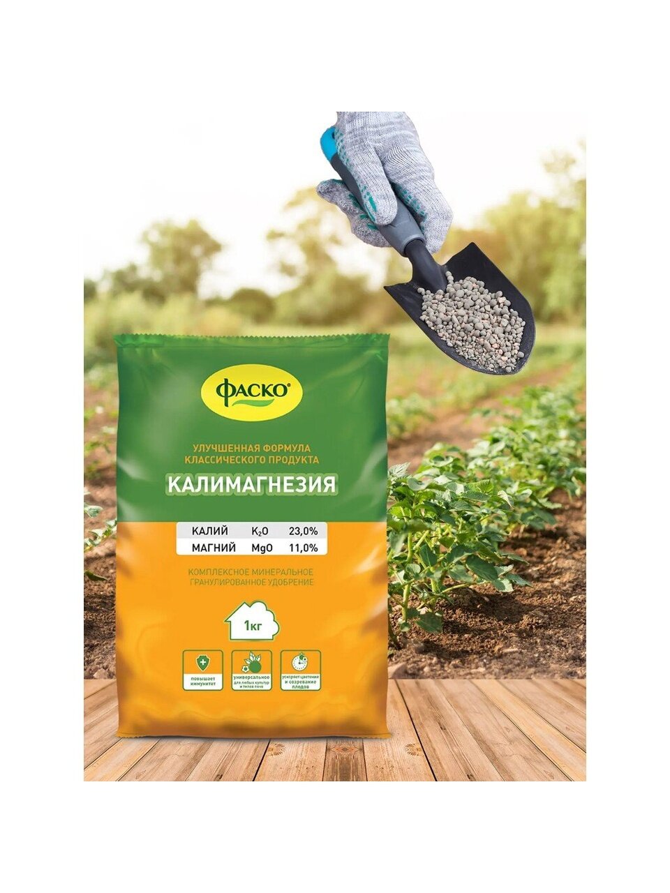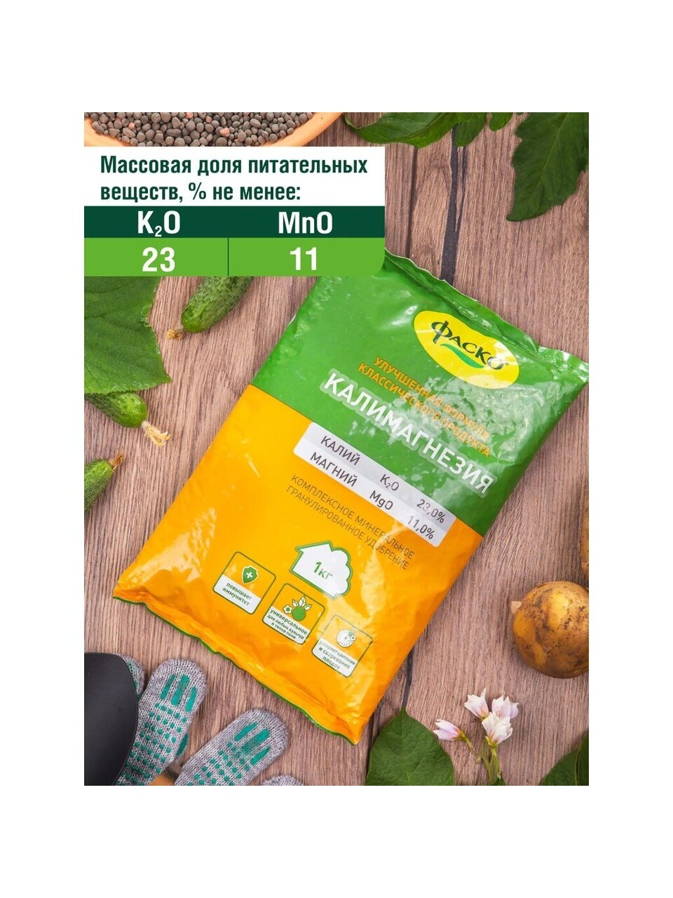 Калимагнезия — это комплексное минеральное удобрение для основного внесения и подкормок в сухом виде для всех типов растений. Средство представляет собой некрупные серые гранулы. В его состав входят калий и магний. Период применения: с апреля по сентябрь.