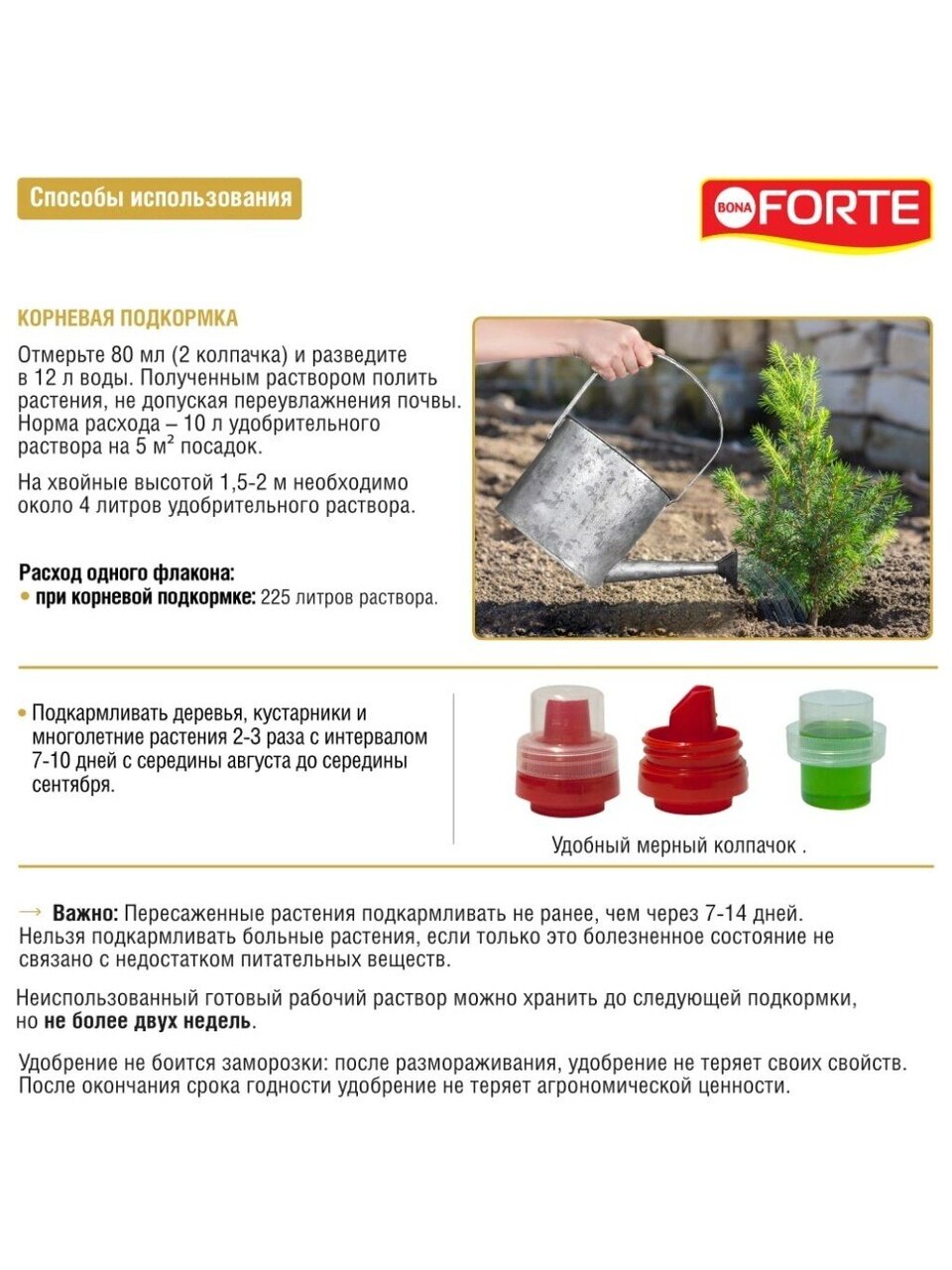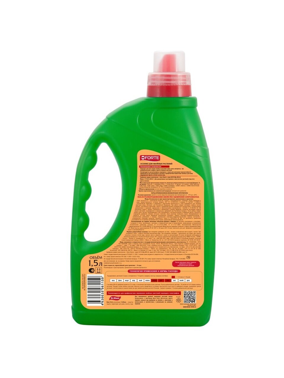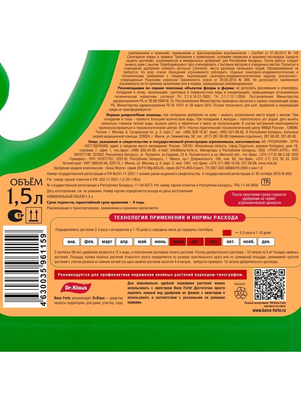 Универсальный объем 1,5 литра позволяет экономично использовать средство на протяжении всего сезона. Удобрение легко разводится в воде, не оставляет осадка и не засоряет поливочные системы. Продукт подходит для использования как в частных садах, так и на больших участках, где требуется поддерживать здоровье хвойных насаждений.