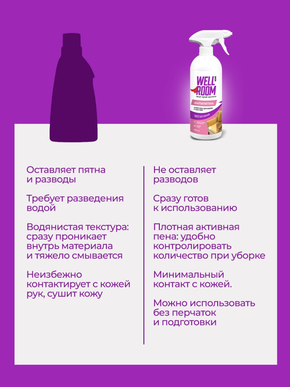Сравнивая с универсальными чистящими средствами, спрей-пена Wellroom обеспечивает более глубокое проникновение и эффективное удаление запахов, что важно для домов с питомцами или в сезон активного использования дачи. Средство не содержит агрессивных компонентов, подходит для регулярного применения и не требует специальных навыков для использования.