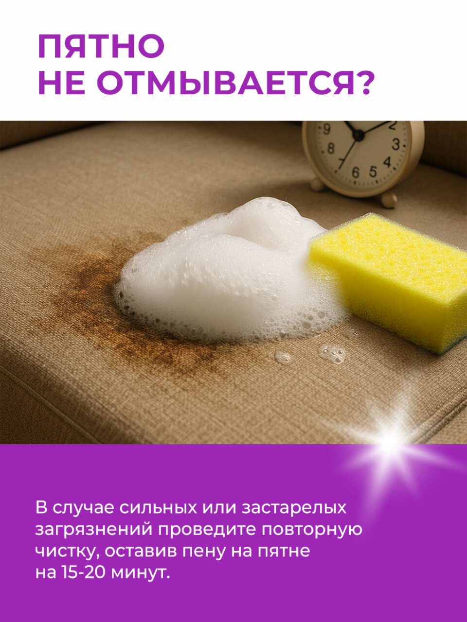 Пенообразующая формула обеспечивает глубокое очищение волокон, быстро устраняет запахи и пятна, подходит для светлых тканей, не оставляет следов и липкости.