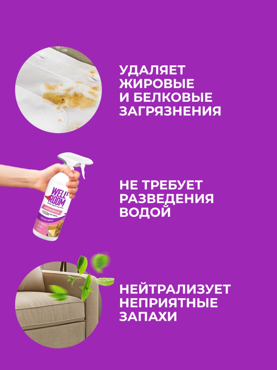 Да, спрей-пена Wellroom подходит для регулярного ухода за обивкой мебели и коврами благодаря безопасной формуле и удобному формату флакона 500 мл.