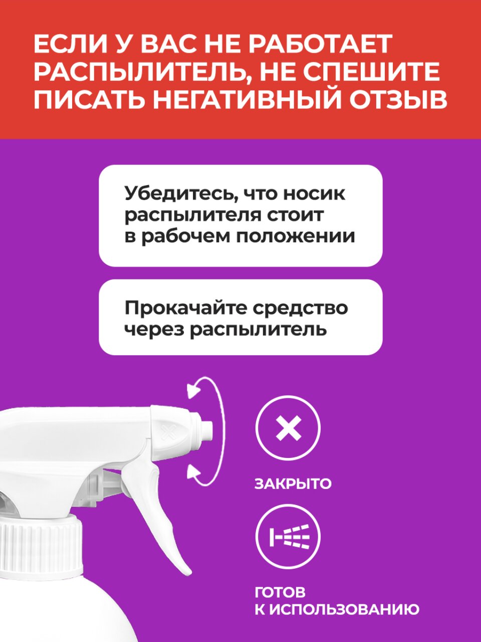 Распылите средство на загрязнённую поверхность, оставьте на 5–10 минут, затем удалите остатки губкой или пылесосом. Не требует смывания водой. Объём флакона — 500 мл, хватает на обработку нескольких ковров или мебели.