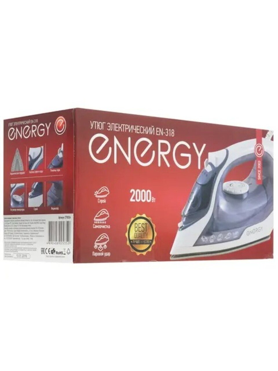 Утюг Energy, EN-318, 2000 Вт, керамика, вертикальное отпаривание, система самоочистки, пар, спрей, удар, 1.5 м