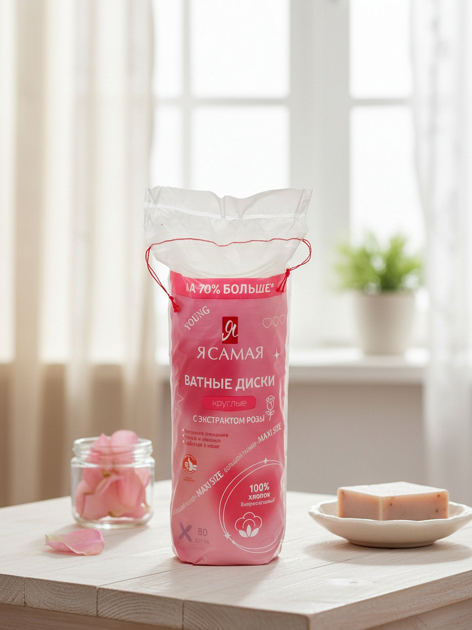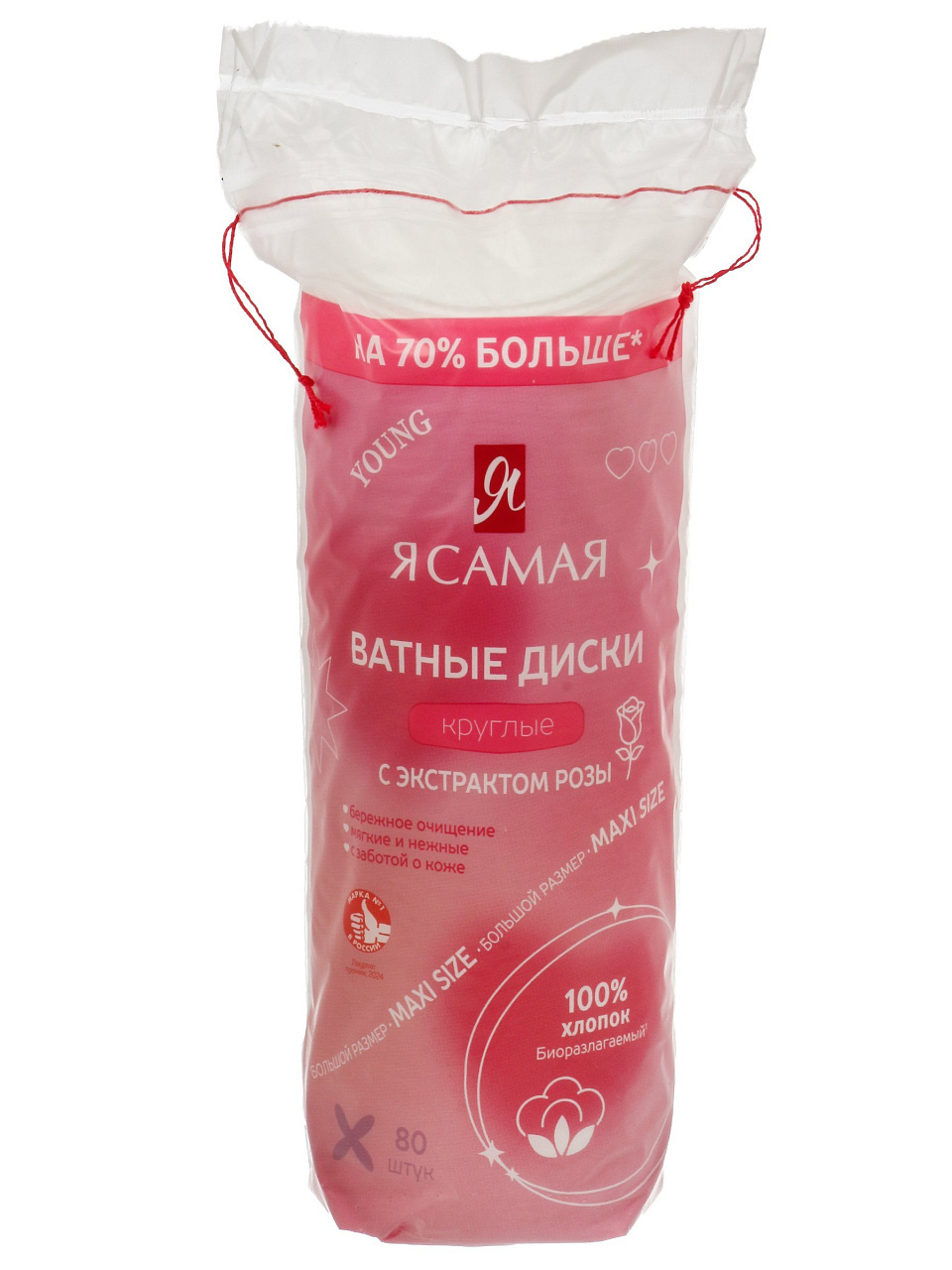 Ватные диски «Я самая» с экстрактом розы (80 шт): нежное очищение и бережный уход для чувствительной кожи.