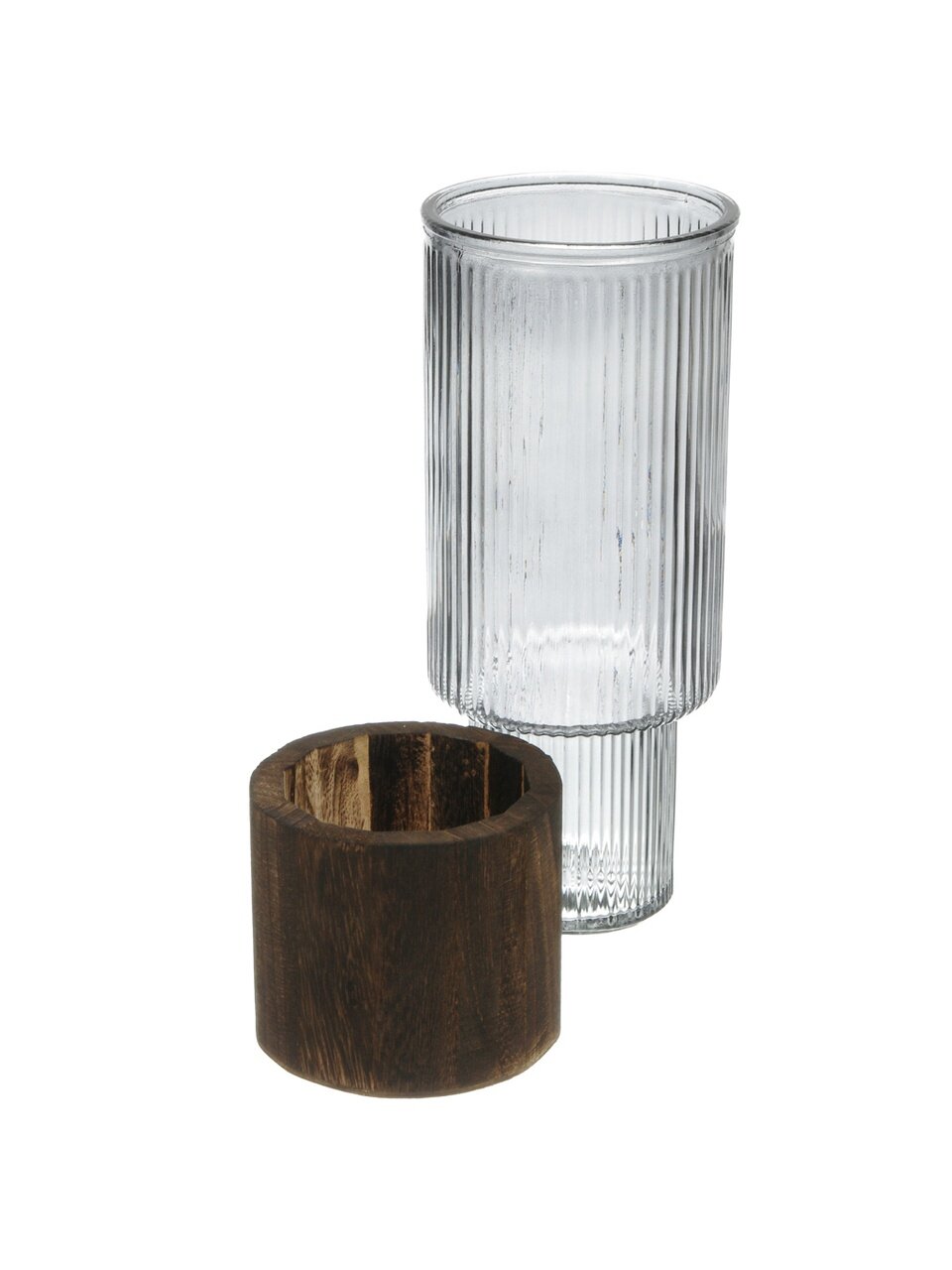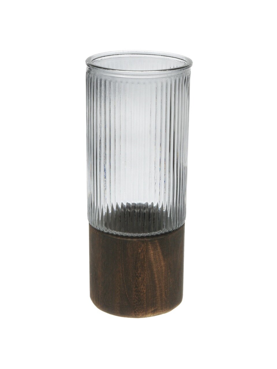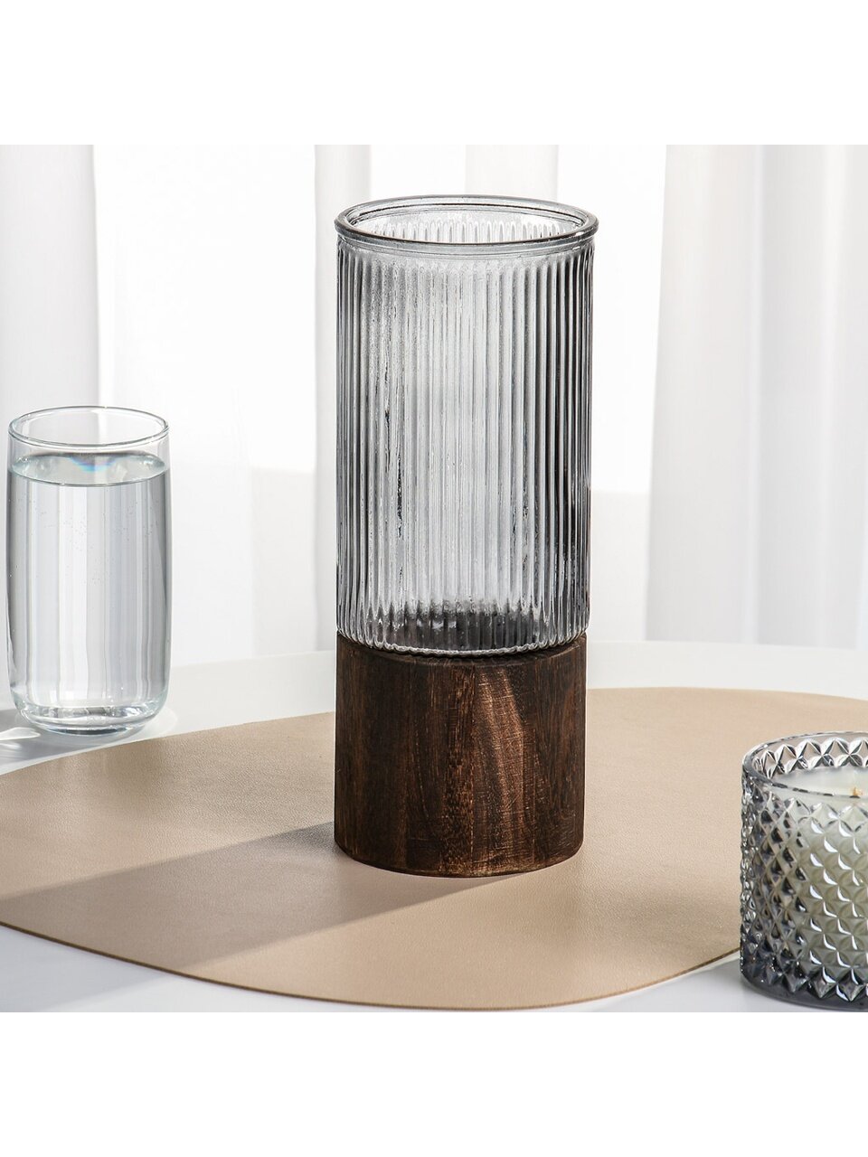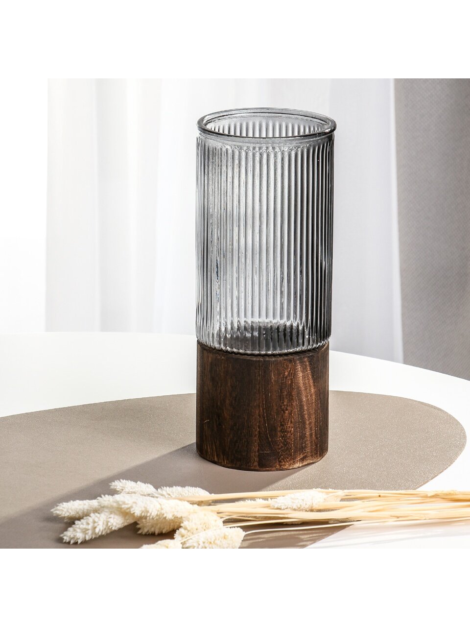 Современная стеклянная ваза Лофт 26 см — стильный акцент для дома и подарка: прочное стекло, серый цвет, уникальный дизайн с полосами и подставкой.