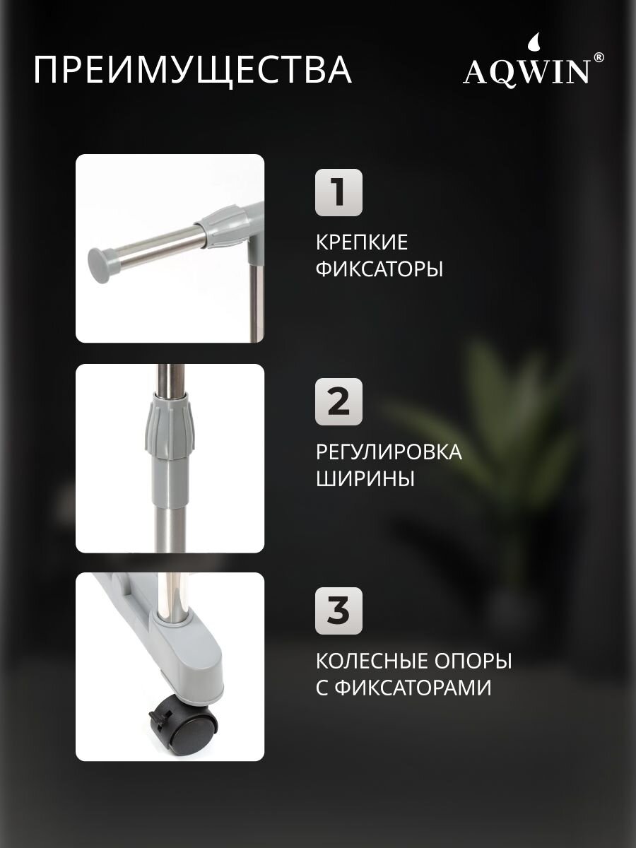 В отличие от стационарных и пластиковых аналогов, металлическая вешалка Aqwin устойчива к износу, не боится влаги и легко очищается. Часто спрашивают: подойдет ли для тяжелых зимних вещей? Да, максимальная нагрузка — 40 кг, что позволяет размещать куртки, пальто и даже обувные коробки на нижней перекладине.