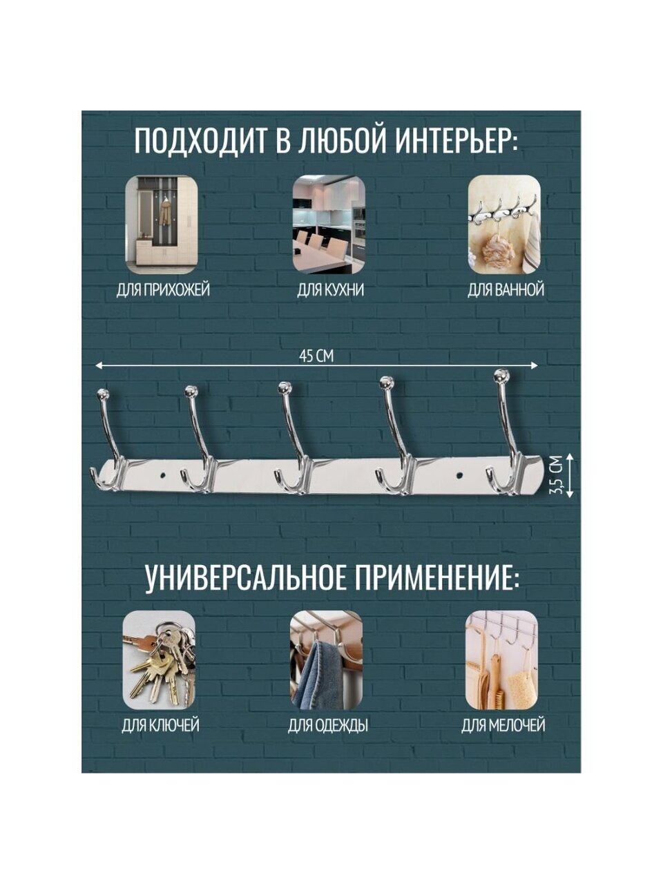 Вешалка настенная на 5 крючков — оптимальный выбор для тех, кто ищет, какой аксессуар лучше всего подойдёт для ванной комнаты или кухни. Благодаря хромированной поверхности, изделие устойчиво к постоянной влажности, не ржавеет и сохраняет внешний вид долгие годы. Простая установка на планке снижает риск повреждения стены, а длина 45 см позволяет разместить полотенца, халаты, аксессуары всей семьи.