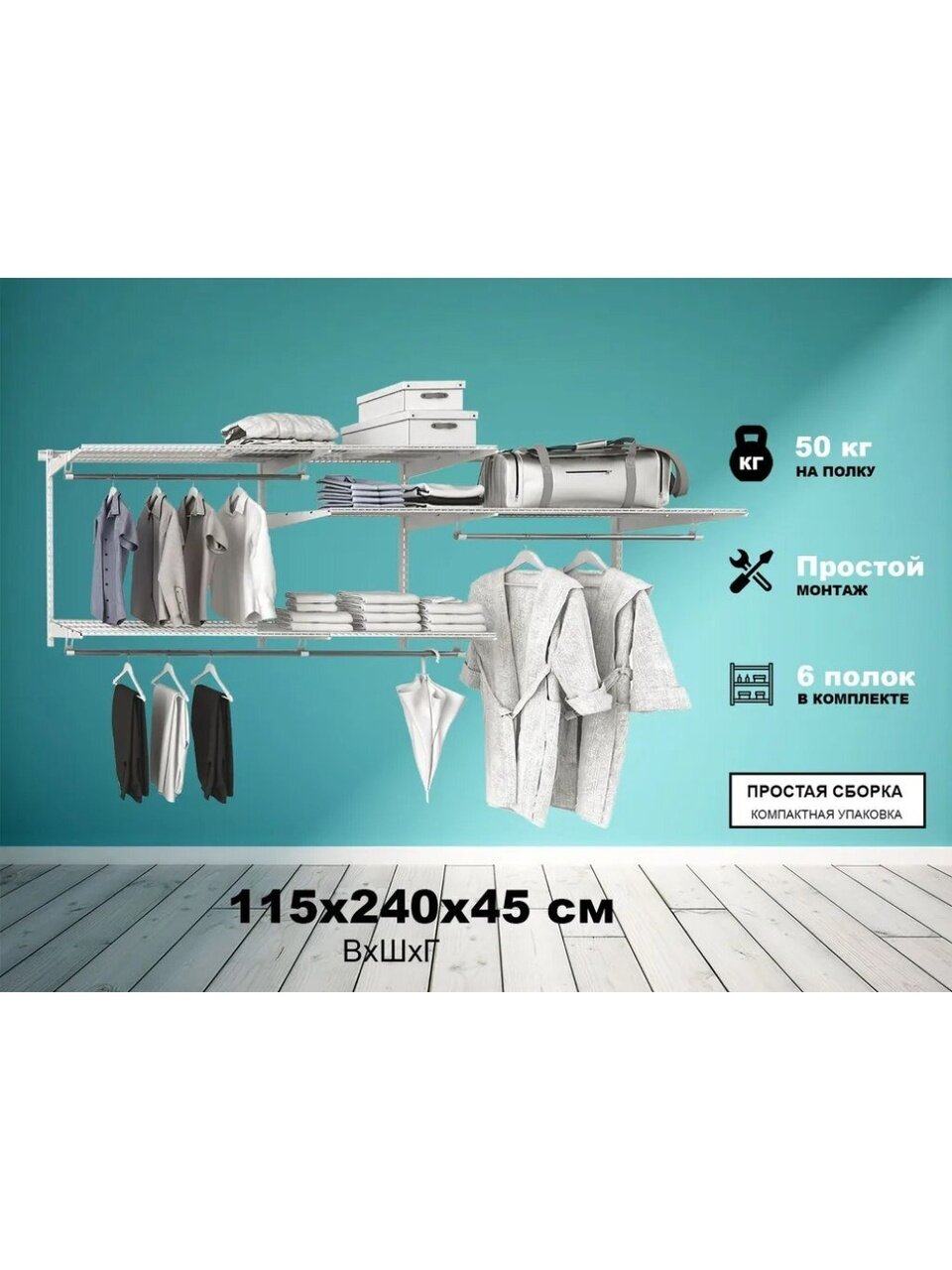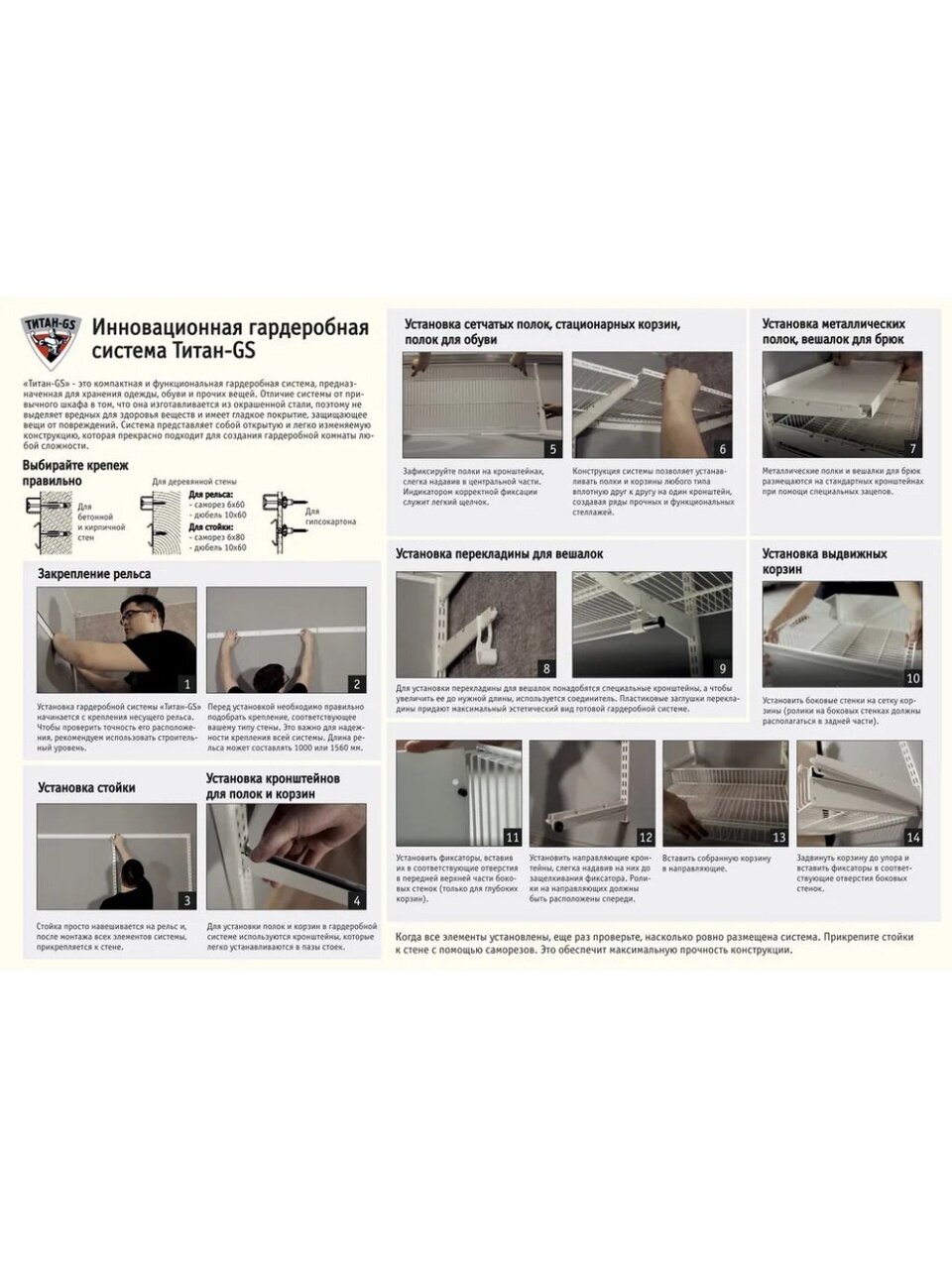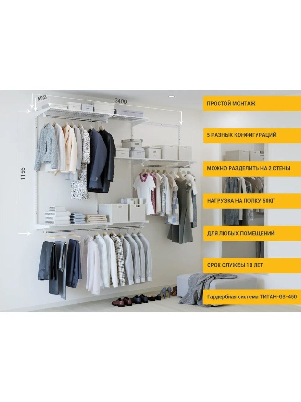 Базовый комплект гардеробной системы Титан-GS "450" - это готовое решение для квартиры, дачи, гаража, обеспечивающее удобное хранение вещей. Система собирается в 5 разных конфигурациях, что позволяет подстраивать ее под размеры помещения и ориентироваться на личные пожелания по расположению отдельных элементов. В комплект входят несущие рельсы и навесные направляющие, полки, штанги, аксессуары, крепежные элементы.
