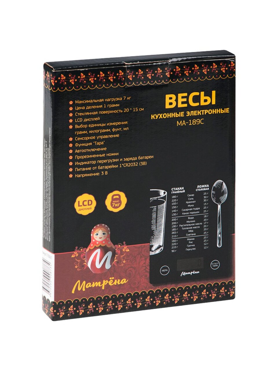 Преимущества покупки — гарантия 12 месяцев, быстрая доставка и возможность купить недорого электронные весы для кухни, дома или дачи. Закажите сейчас и оцените точность и удобство приготовления с Матрена МА-189C!