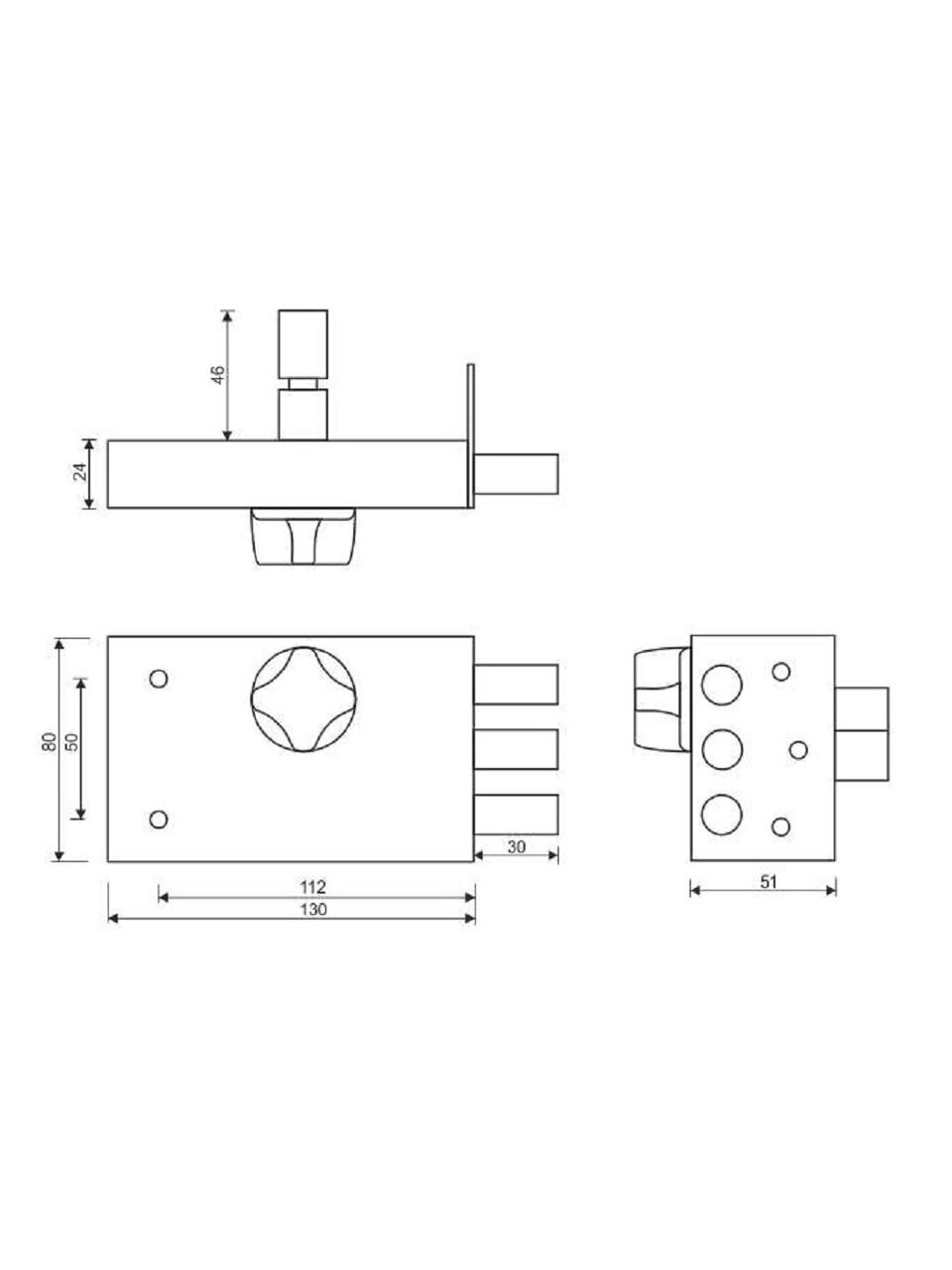Замок накладной цилиндровый с вертушкой. Предназначен для установки на деревянные двери. Засов из трех цилиндрических ригелей диаметром 14 мм, с максимальным вылетом 30 мм. Удаление ключевого отверстия - 60 мм. Габариты замка - 130х80х24 мм. Комплектация - 5 ключей, запорная планка, накладка. Механизм замка под перфо-ключ, идет совместно с корпусом. Закрывание и открывание замка изнутри производится вертушкой, снаружи ключом.