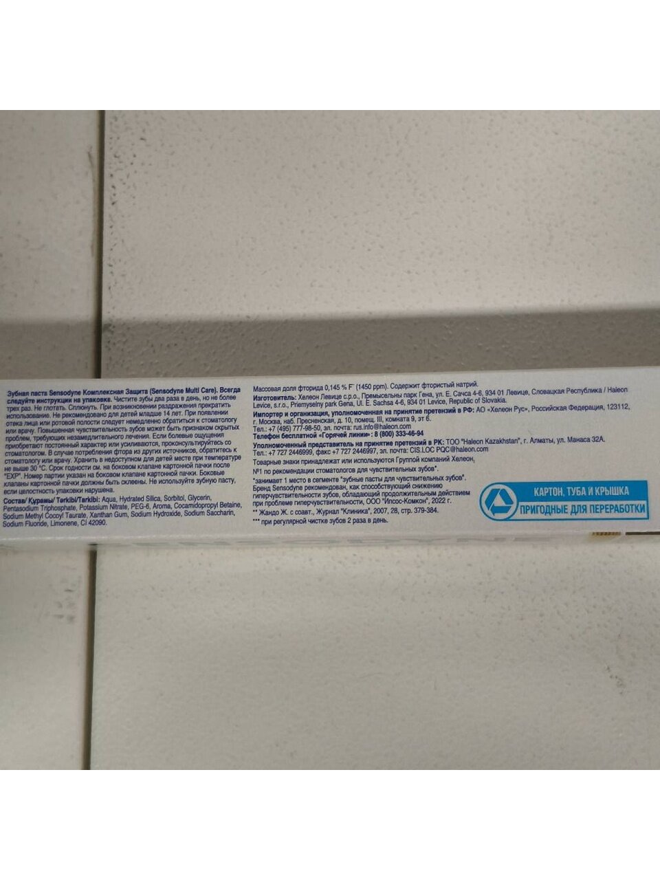 Зубная паста Sensodyne Комплексная Защита образует защитный слой на поверхности чувствительных участков ваших зубов для длительной защиты от чувствительности. Обладает всеми преимуществами ухода за полостью рта, которые вам необходимы, в одном комплексном средстве для чувствительных зубов. При чистке зубов 2 раза в день зубная паста Sensodyne Комплексная Защита также защищает от образования зубного налета и поддерживает здоровье десен. Паста обладает приятным вкусом и запахом и оставляет во рту ощущение чистоты и свежести.