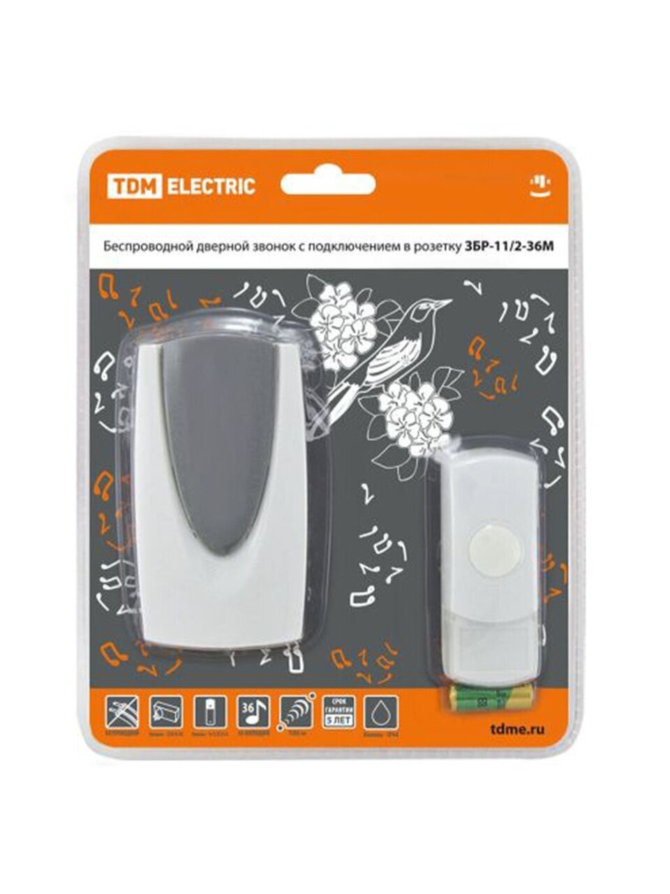 Звонок дверной беспроводной, сетевой, 36 мелодий, кнопка IP 44, 230 В, TDM Electric, ЗБР-11/2-36М, SQ1901-0009